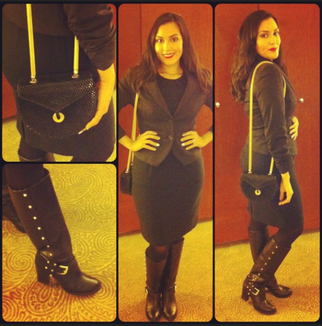 Here was my OOTD for my dinner at Filomena in Washington D.C. My favorite thing about this outfit is my vintage Sondra Roberts black and gold purse. Its strap is a hard gold mesh as is the snap closure. The purse itself is covered in a sequin-like fabric. It’s absolutely fab! Can’t tell you how much I love it. My second favorite item would be my Michael Kors leather boots with gold studs along the outer sides and gold buckle.