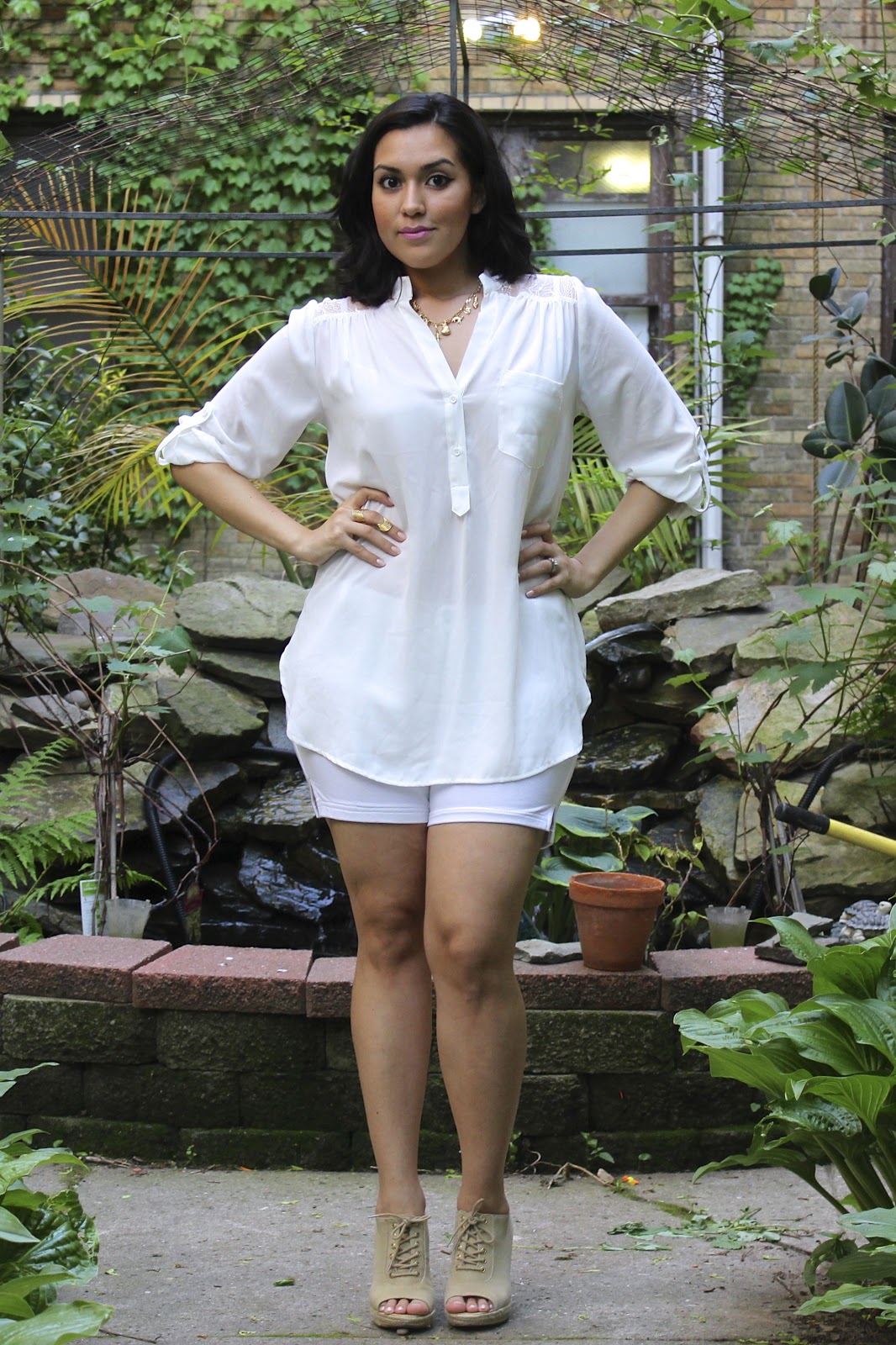 In this Outfit of the Day, I’m wearing a long, sheer white Pleione blouse with lace shoulder panels. The shorts are stretchy and super comfy. I purchased these MRKT olive khaki colored canvas wedges at DSW. I love that they’re peep-toe and have gold hardware. I finished the look with some of my 18k Colombian gold pieces and MAC’s Raspberry Swirl lipstick (one of my Top 10 Spring/Summer Lipsticks).