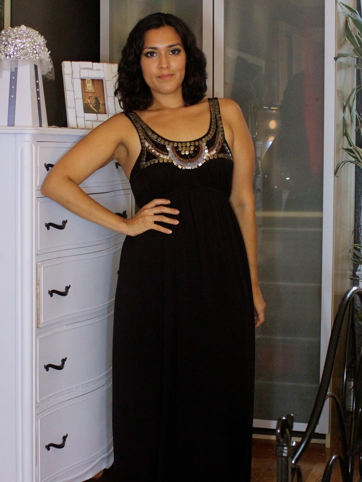 I love maxi dresses. They’re super simple and easy to dress up or down. In this Outfit of the Day, I’m wearing a black bailey blue dress that I purchased on Poshmark. It’s beautifully embellished with metallic beads and sequin at the top. You can easy pair this with almost anything since the metallic embellishments are shades of black, silver, bronze and copper.