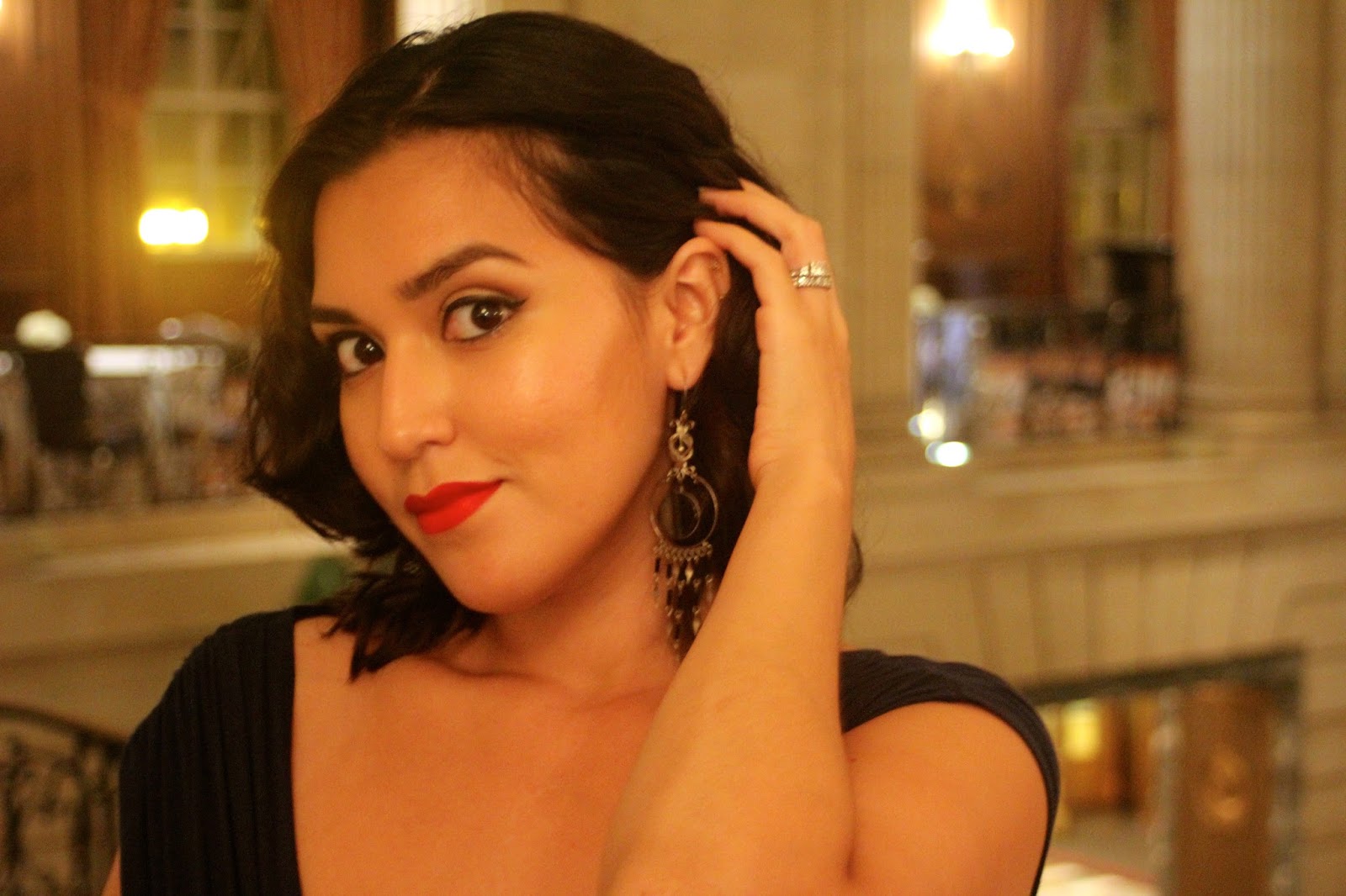 Hice mi maquillaje sencillo y un poco pinup. Usé Brule de MAC en el párpado y en el hueso de la ceja y usé Swiss Chocolate de MAC en el pliegue del ojo para crear definición. Usé Smolder por MAC para alinear mis líneas de las pestañas superiores e inferiores y un poco de rubor Melba por MAC en mis mejillas. Usé Tattoo Liner en Trooper por Kat Von D para crear un ala. Terminé el look con un mancha de labio por Sephora llamado Always Red cubierto con Fbomb de Urban Decay para crear un intenso labio rojo.
