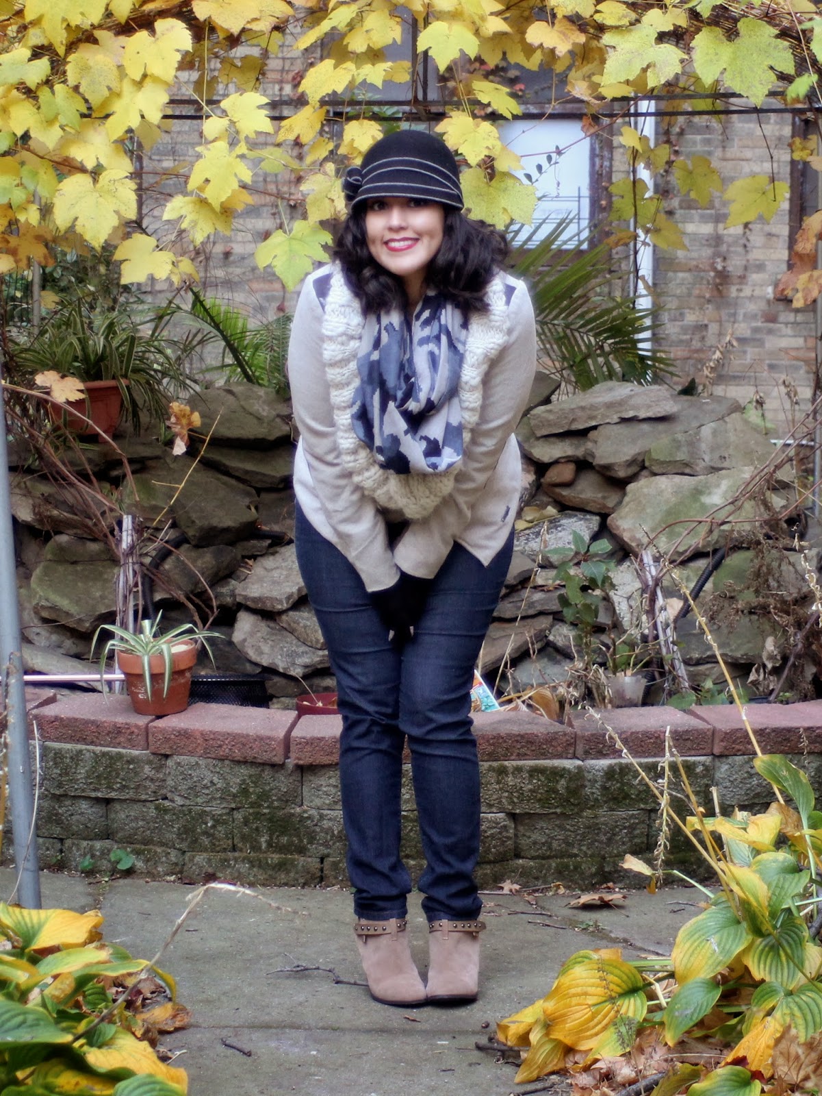 An Infinity scarf has become a real staple in many people’s closets. And it’s no surprise. They are trendy, stylish, warm and feel so good wrapped around your neck. I love using them as my Outfit of the Day‘s pop of color. It’s also a safe way to incorporate a fun print or pattern if you’re a bit hesitant to try them. The one I’m wearing has a graphic print (that looks like camouflage from afar) in shades of blue, gray and black.