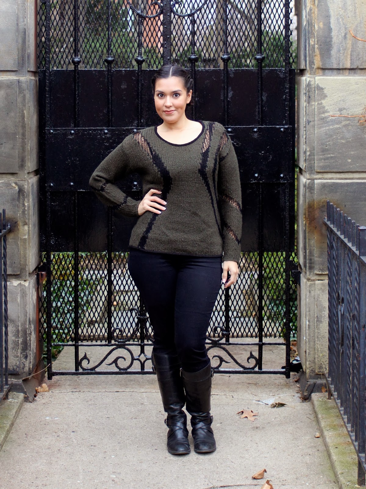 The black skinny jeans are dENiZEN by Levi’s, which I picked up Target. They’re a staple piece that every woman should own. You can wear them in a classic Audrey Hepburn style with a cute pair of flats or tucked in boots, like I’m wearing them here. The black knee-high boots with gunmetal hardware are by S.E. Boutique. I love Sam Edelman so I snatched these up as soon as I saw them on sale at DSW.