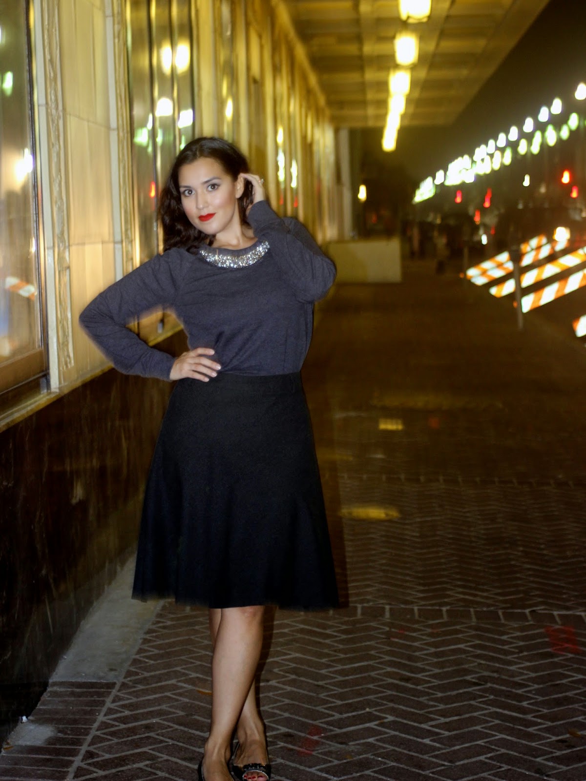 As an outfit of the night, I swapped the jeans for an A-line wool skirt from Zara. It’s also gray and the wool goes well with this warm and cozy holiday outfit look.