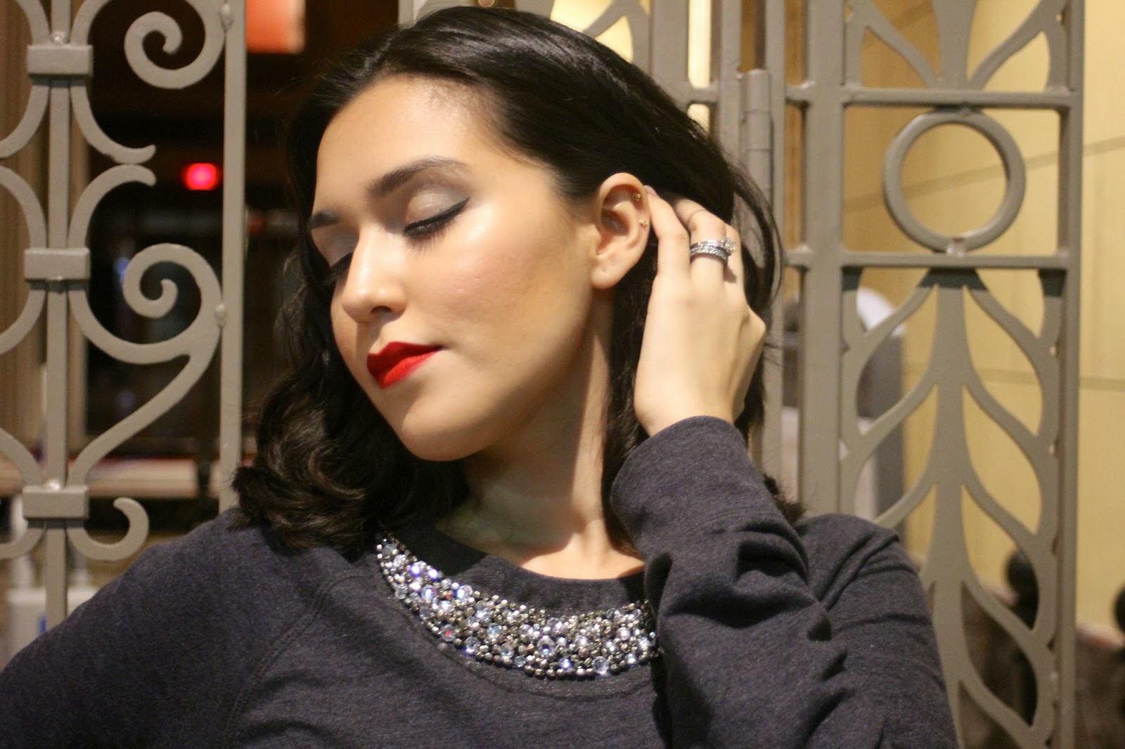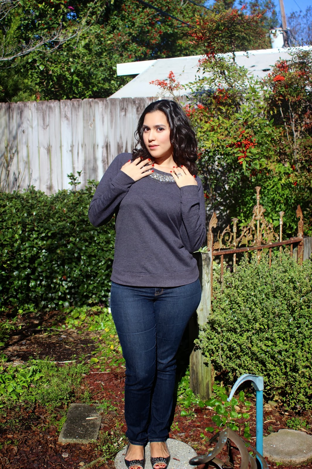 For an outfit of the day look, I’ve paired the sweatshirt with skinny jeans from The Limited. I also kept the gray and sparkly theme going with this pair of Beverly Feldman metallic peep-toe flats.