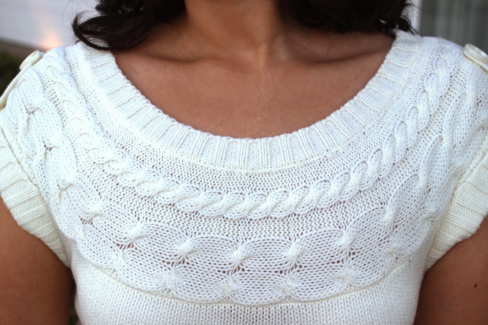 The collar is embellished with beautiful woven knit patterns. The collar is just wide and deep enough to frame the collar bone.