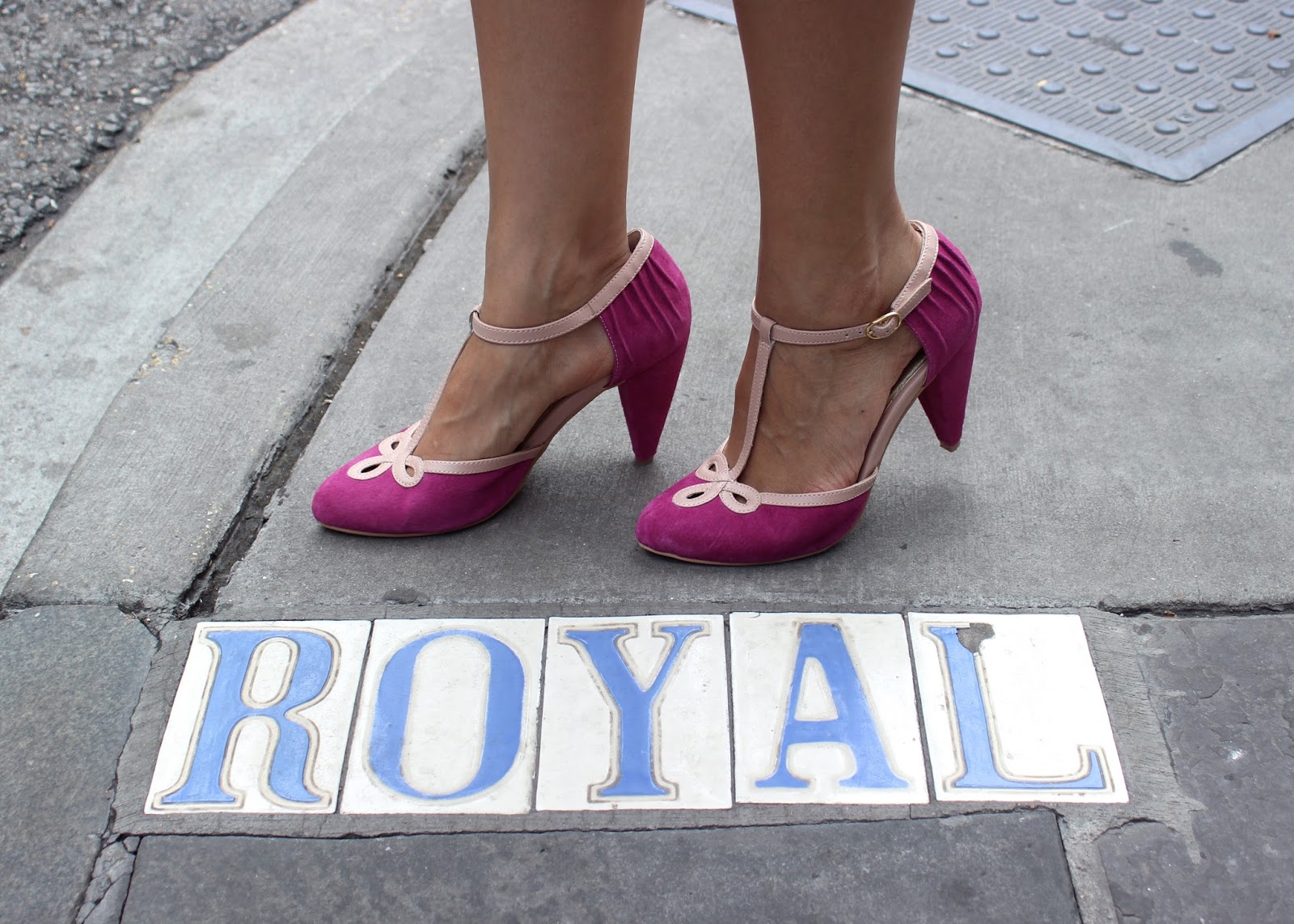 These gorgeous shoes are by one of my favorite vintage-reproduction shoe companies, Seychelles. They have an array of shoe styles that go from mid-century through the 70s. I feel in love with this pair as soon as I saw them. The light pink straps against the fuchsia faux suede is stunning. They’re a perfect Spring shoe.