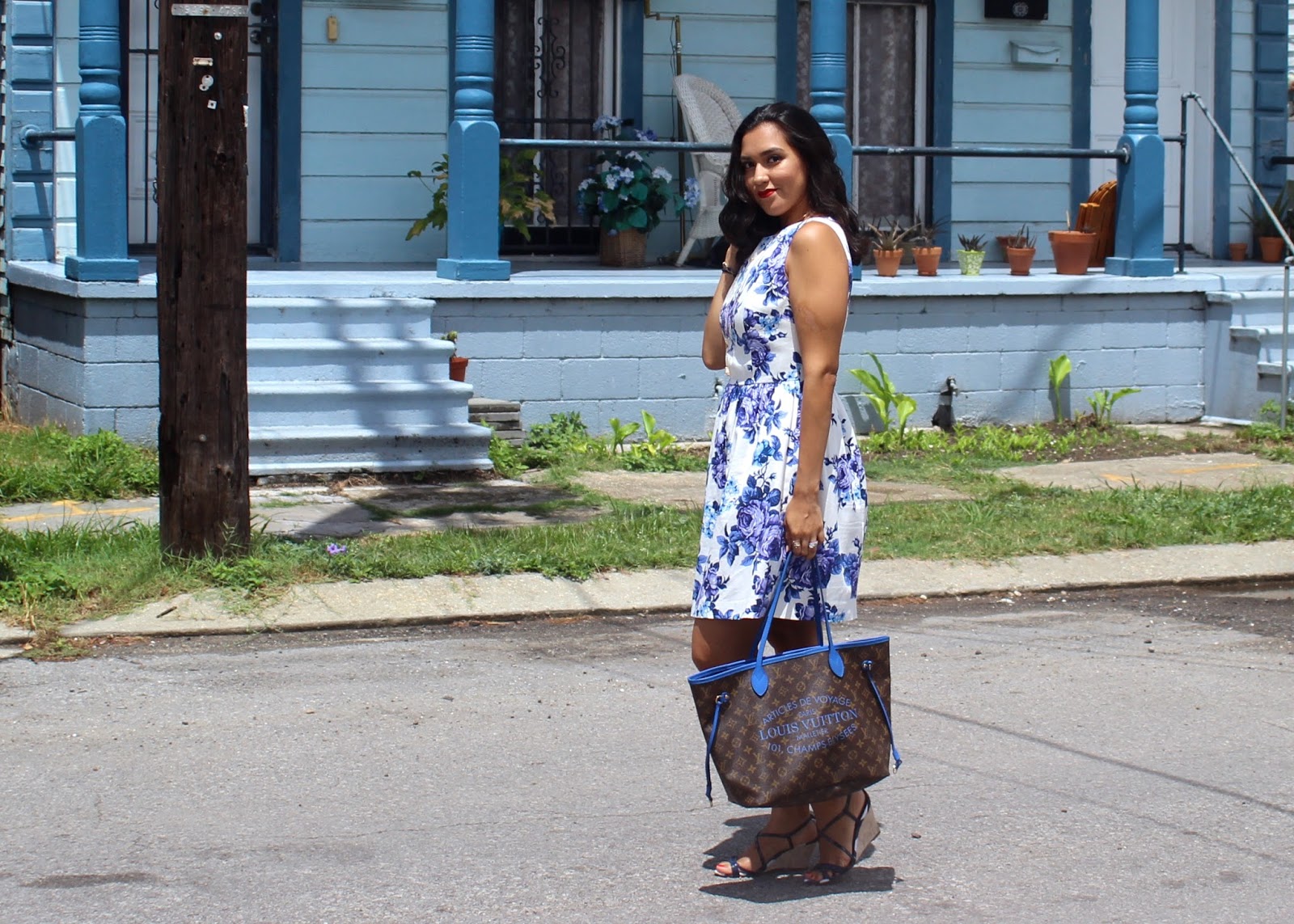 I paired it with blue patent leather sandals from Burberry. These strappy sandals are perfect for warm weather looks. The wedge adds some comfortable height for walks around the French Quarter and Faubourg St. John (where these photos were taken).