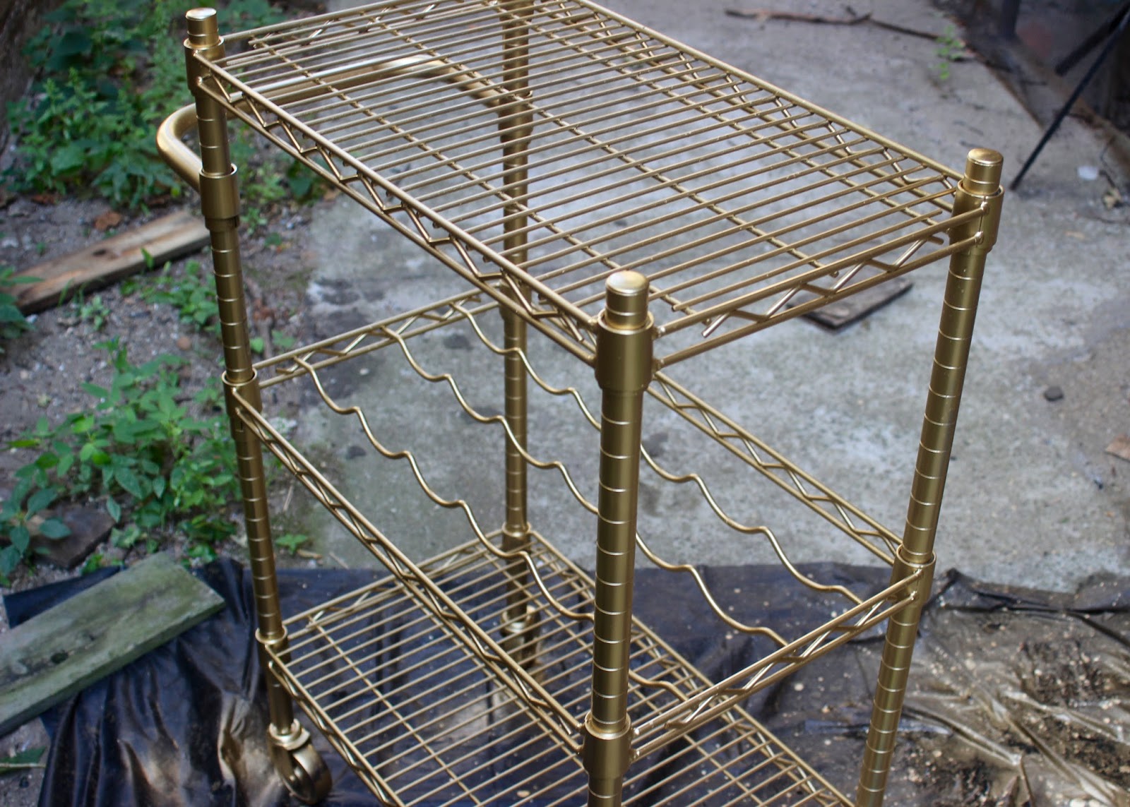 Once clean and dry, begin to paint the cart using your metallic gold spray paint of choice. I’m using Rust-Oleum Specialty Metallic spray paint in gold. I used up two cans but get the amount you’ll need depending on the size of your cart.