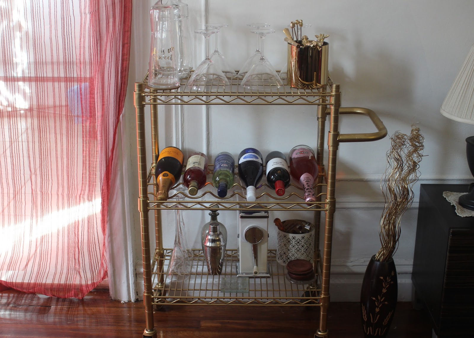 I have fallen in love with the look of gold rolling bar carts but not the price. One of my favorite furniture companies to stalk on Instagram sells their infamous bar carts for $700! Don’t get me wrong. I think these specific bar carts are beautiful and the quality is worth your dollars, however, I personally don’t have the money to shell out $700 for a bar cart at the moment.
