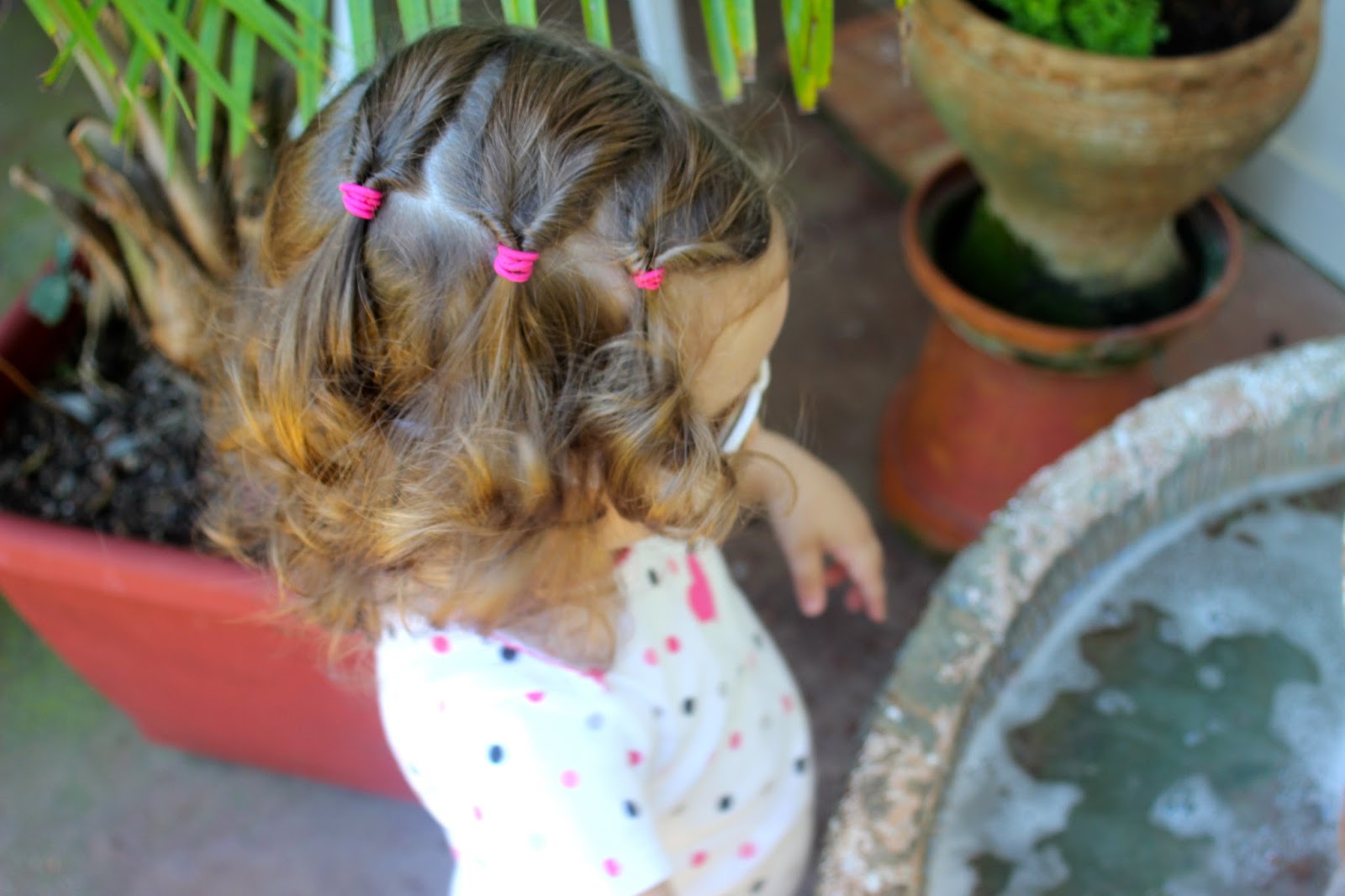 Para terminar esta traje del verano, separé el su pelo a un lado y creé tres colas tipo nudo a un lado. Esto mantiene su increíble cantidad de pelo (gracias a los genes de mi familia) de la cara de una manera adorable y pulido. Me encanta probar nuevos peinados de niños pequeños. Vea algunos de mis estilos favoritos en mi perfil Pinterest.