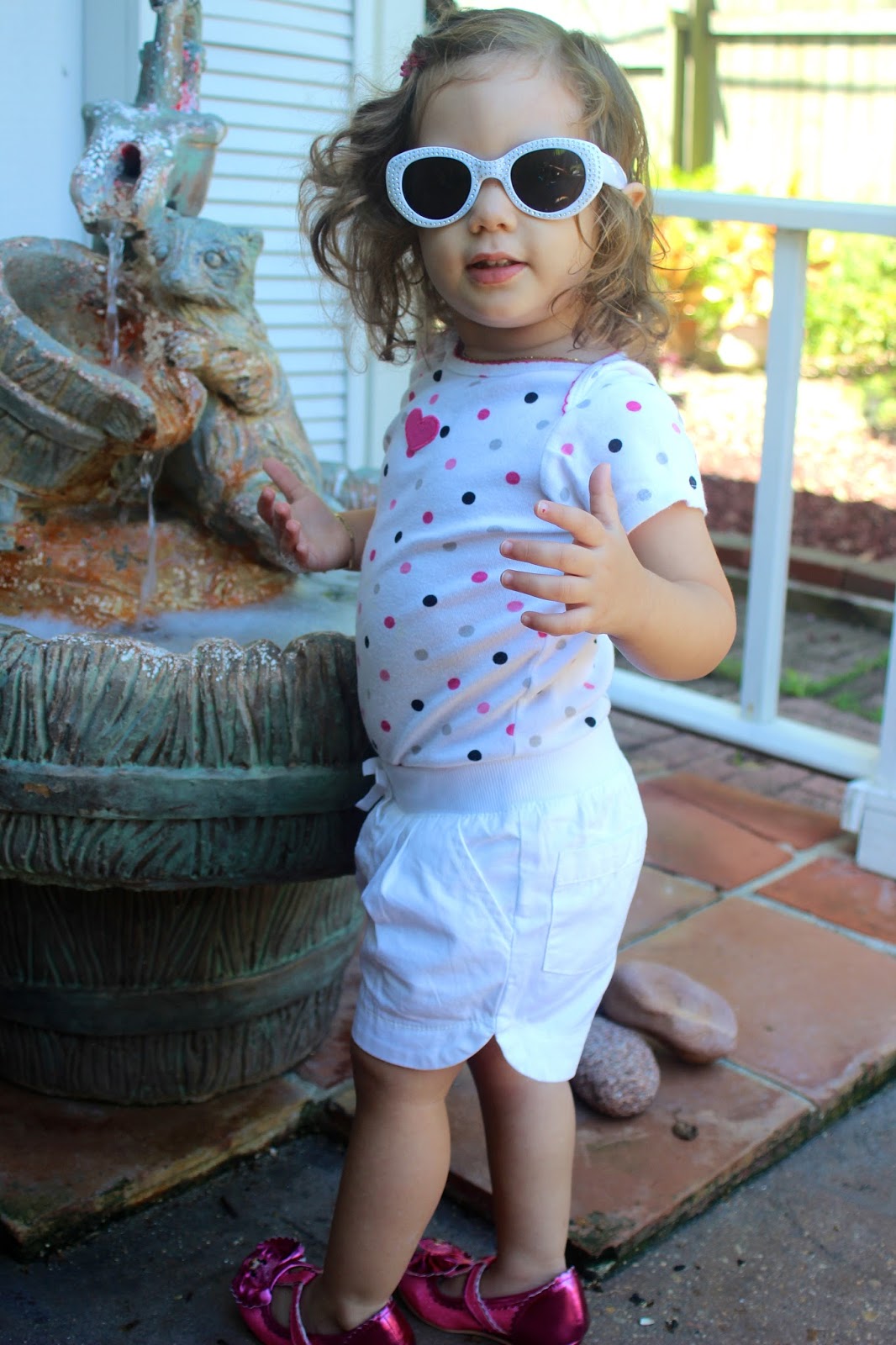 To finish of this summer look, I parted her hair to the side and created three knot pony tails to the side. This keeps her unbelievable amount of hair (thank you family genes) away from her face in an adorable and polished way. I love trying new toddler hairstyles. See some of my favorite styles in my pinterest profile.