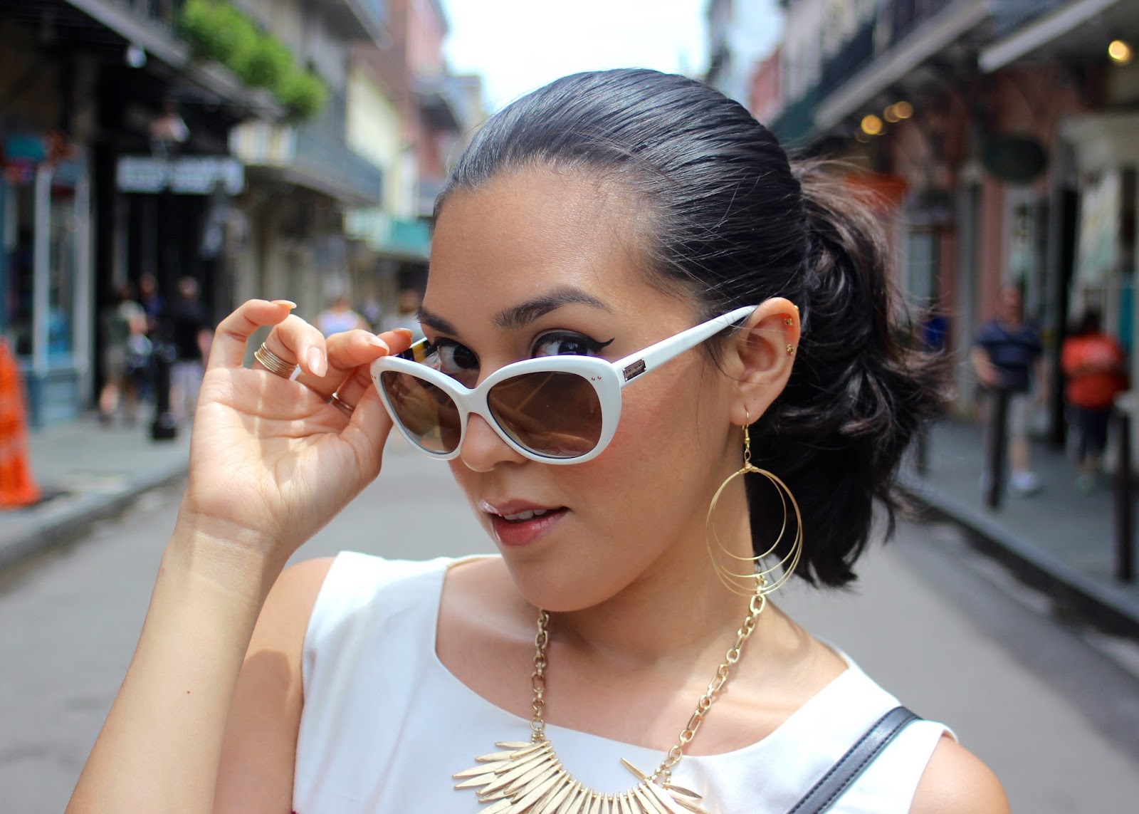 I’m also wearing my new Box of Pearls wired hoop earrings. I purchased them at a great boutique on Magazine St. called Lucy Rose. I’m always in search of locally designed items and that’s an amazing place to find some. To finish this look, I added one of my new favorite pairs of sunglasses by Kate Spade. These white cat eye sunglasses are perfect to top off any summer look.