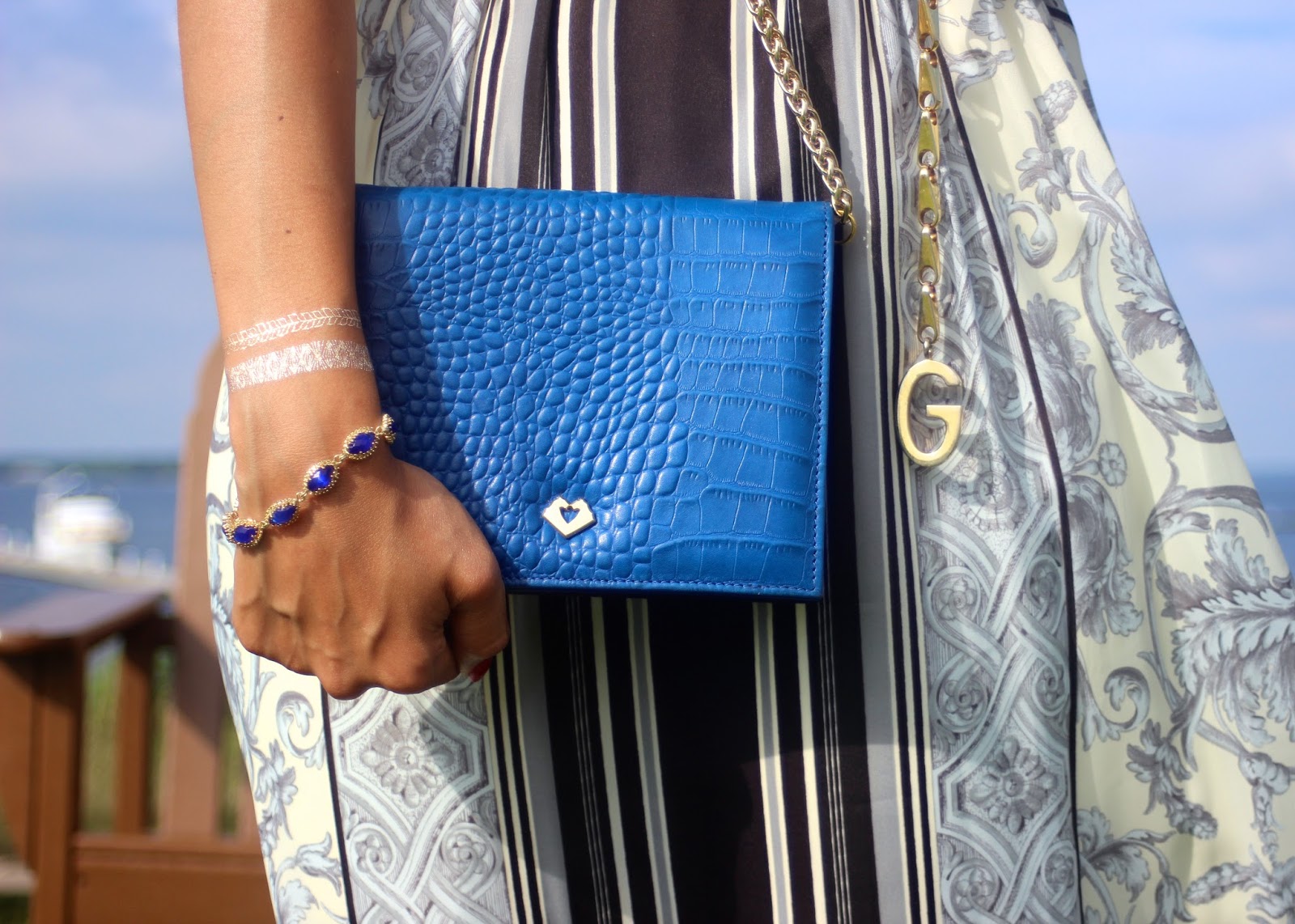 También tengo puesto una pulsera de Kendra Scott de metal dorada con piedras azules. Hace un buen juego con mi cartera de Mary Lai. Esta cartera tiene dos fachadas diferentes. ¡Así que es como tener dos carteras en uno! Puede ver el otro lado de esta cartera aquí.