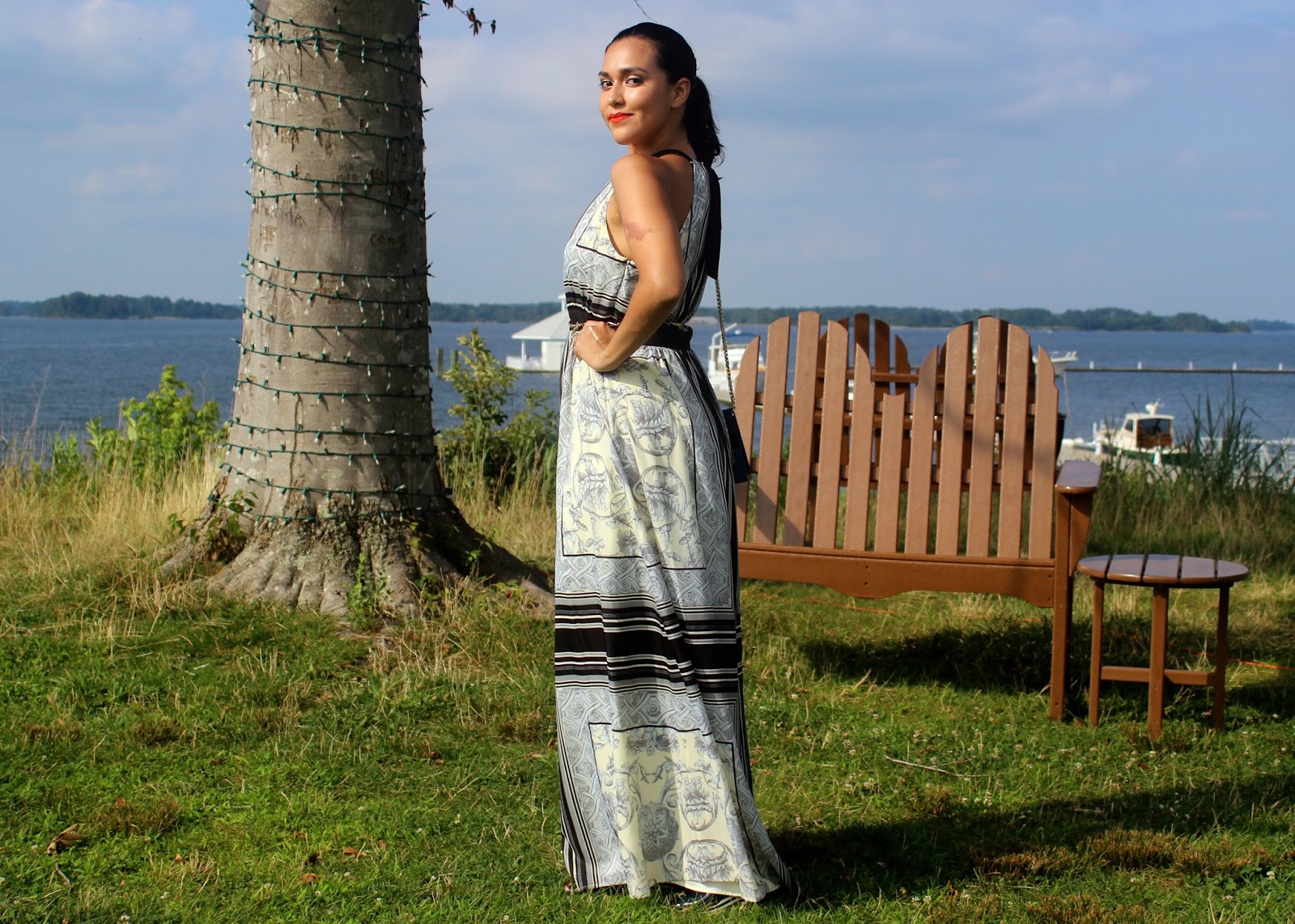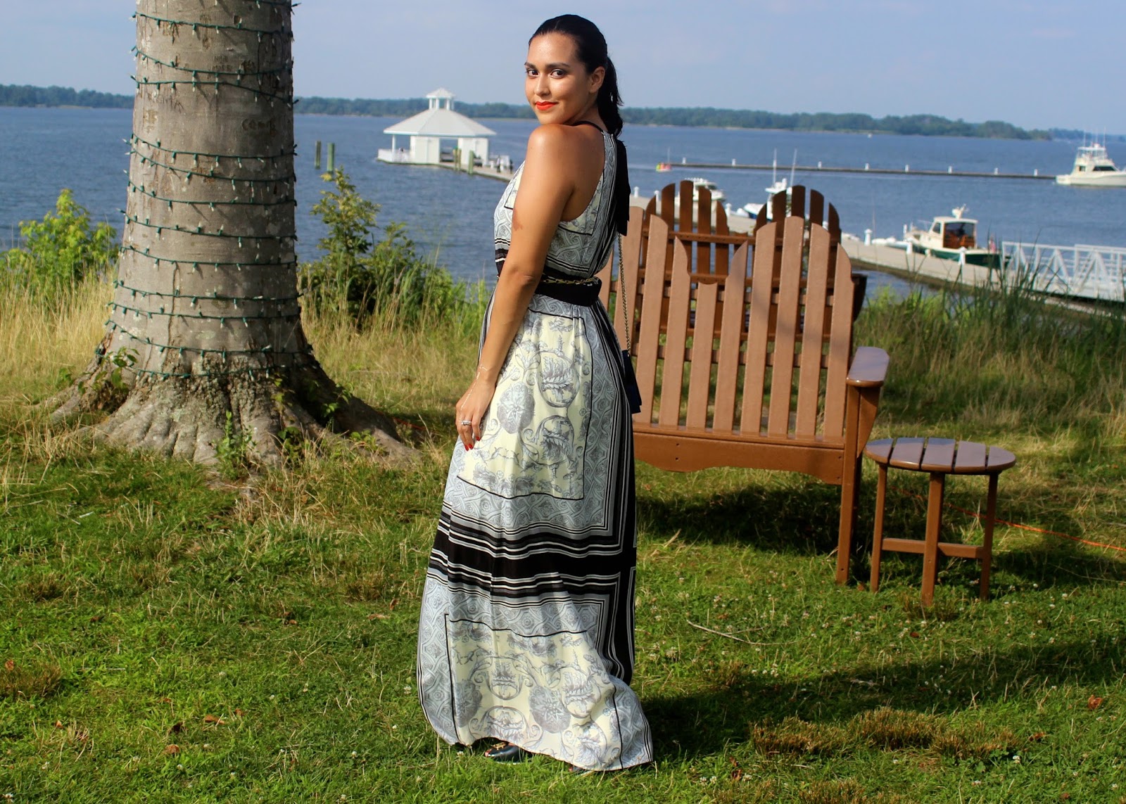 En mi estadia en el Hyatt Regency Chesapeake Bay Golf Resort, Spa and Marina usé este vestido largo de Vince Camuto. Es bello y me encanta como las lineas del vestido me hacen ver mas alta.