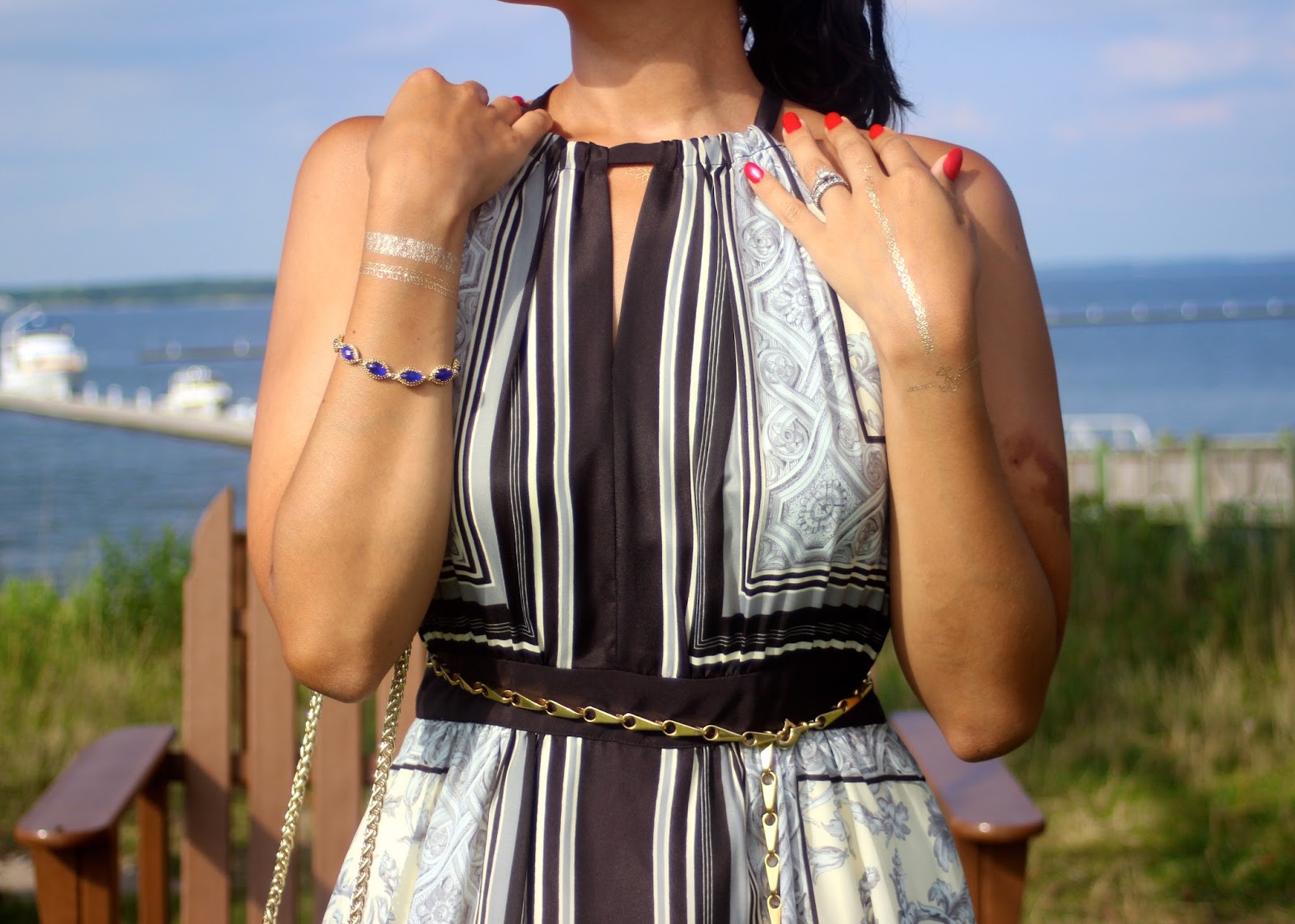 Agregué un toque de brillo moderno con los tatuajes modernos de Lionheart Print y Kismet Cosmetics. Uso una correa dorado por Gucci para ajustar mi cintura.
