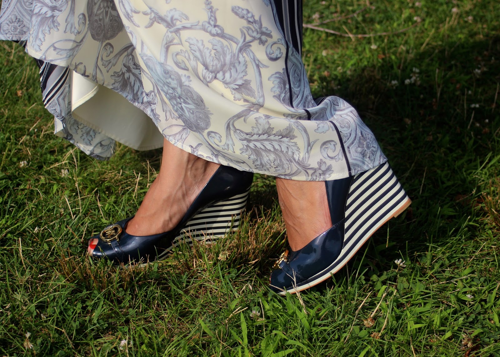 Mis zapatos son de Michael Kors. Son de charol en color azul marino. Tiene medallones con los initiales MK.