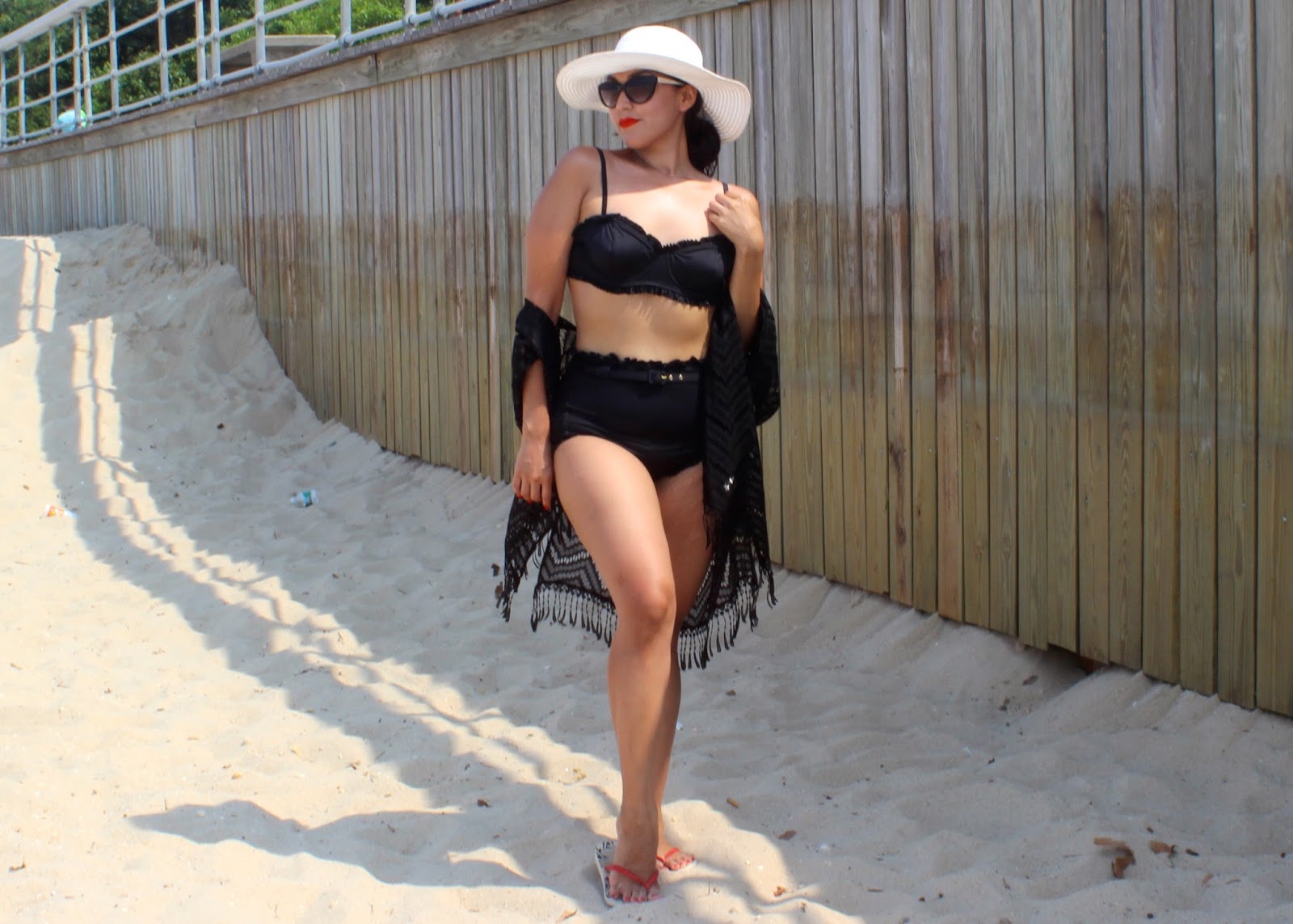 Para protejerme del Sol, estoy usando gafas de Kate Spade y un gorro de Prima Donna. Tambien tengo chancletas de Havaianas. Estoy usando maquillaje estilo retro. Las sombras son del Naked Smokey Paletter de Urban Decay y el Play Paraiso Lip & Cheek de CIRCA Beauty. Añadí toques rojos con el labial Underage Red de Kat Von D y el esmalte Rouge Louboutin de Christian Louboutin. ¿Como se visten para ir a la playa? Déjeme saber en la sección de comentarios.
